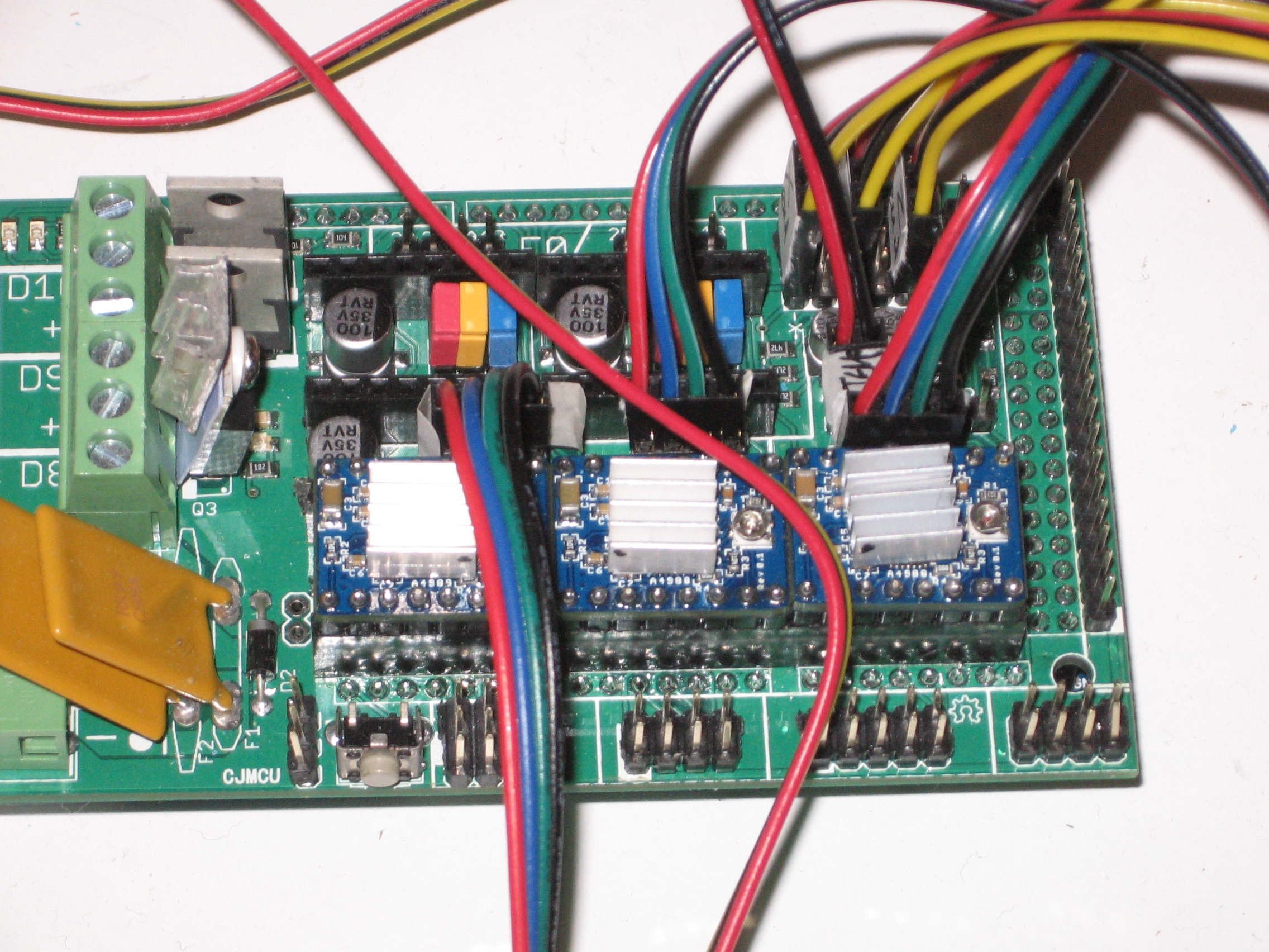 Make sure that all three jumpers need to be placed under each stepper driver. (red yellow blue in the photo above). We setting 1/16 micro stepping by installing all jumpers under the drivers. Place the four drivers at Ramps.